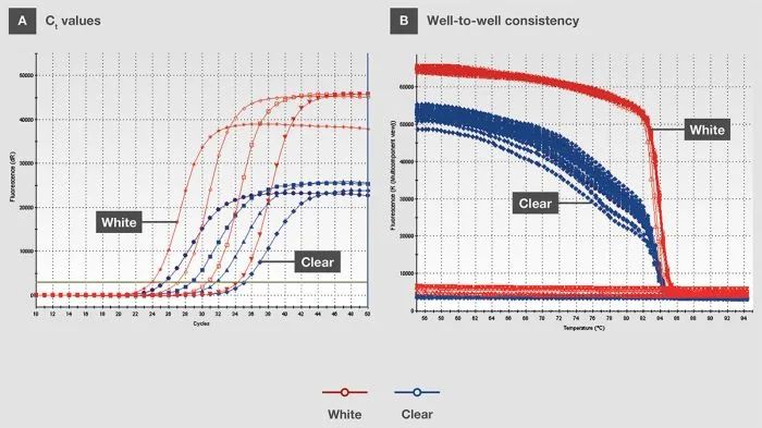 白色耗材通過阻止熒光折射出管(圖2A)來提高qPCR數(shù)據(jù)的靈敏度和一致性。折射被最小化時,更多的信號被反射回檢測器,從而增加信噪比(圖2B)。此外,白色管壁可阻止熒光信號傳遞至PCR儀模塊,避免被吸收或不一致地反射熒光信號,從而使重復(fù)實驗(圖1B)中的差異降至最低。在極少數(shù)情況下,如果熒光探測器由于白色孔的信號反射增強而過飽和,可以使用磨砂孔替代。