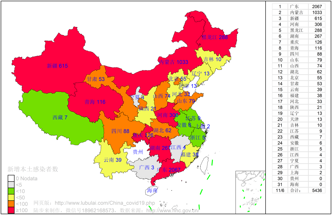 11月6日0—24時,31個省(自治區、直轄市)和新疆生產建設兵團報告新增確診病例569例。其中境外輸入病例34例(廣東10例,福建6例,北京3例,四川3例,內蒙古2例,上海2例,江蘇2例,天津1例,遼寧1例,浙江1例,山東1例,云南1例,陜西1例),含4例由無癥狀感染者轉為確診病例(北京1例,天津1例,江蘇1例,四川1例);本土病例535例(其中廣東224例,內蒙古57例,河南42例,重慶42例,北京41例,新疆30例),含60例由無癥狀感染者轉為確診病例(廣東39例,四川5例,北京4例,陜西3例,黑龍江2例,福建2例,青海2例,山西1例,云南1例,寧夏1例)。