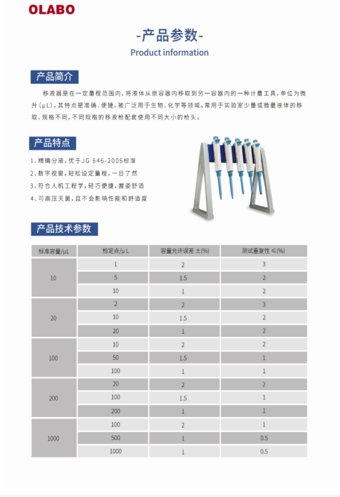 國產OLABO,B系列單道可調式移液器10-100μl量程:10-100μl,精確分液,數字視窗,符合人體工學,握姿舒適