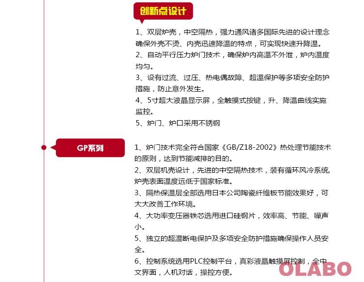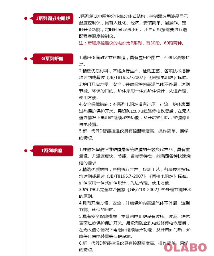 1、T系列爐膛---硅酸鋁陶瓷纖維爐膛是傳統(tǒng)爐膛的升級(jí)換代產(chǎn)品,具有重量輕、升溫速度快、節(jié)能、省時(shí)等特點(diǎn),能滿足各種快速燒結(jié)的要求. 2、精選優(yōu)質(zhì)材料,嚴(yán)格執(zhí)行生產(chǎn)、檢測(cè)工藝4、爐門結(jié)構(gòu)采用全方位密封技術(shù)。具有開啟方便、安全,并確保爐內(nèi)高溫氣體不外漏,達(dá)到節(jié)能、環(huán)保的目的。 3、具有安全保障措施:本系列電阻爐設(shè)有過壓、過流、爐體表面過熱保護(hù)保護(hù)開關(guān)。另設(shè)有防止供電線路停電恢復(fù)后,在無人值守情況下電阻爐繼續(xù)加熱功能;及開啟爐門后,爐膛停止供電裝置等保護(hù)設(shè)施。 4、新一代PID智能控溫儀具有控溫精度高、操作簡(jiǎn)單、易學(xué)的特點(diǎn)。